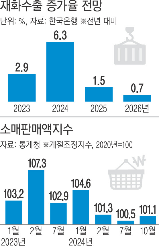 한국의 수출 성장 전망은 다소 밝은 편입니다. 2023년부터 2026년까지의 수출 성장률 예측에 따르면, 2024년에는 6.3%의 성장을 기록할 것으로 예상되고 있습니다. 그러나 이후에는 성장률이 감소할 것으로 보입니다. 이는 트럼프의 관세 정책과 같은 외부 요인에 의해 영향을 받을 수 있습니다.